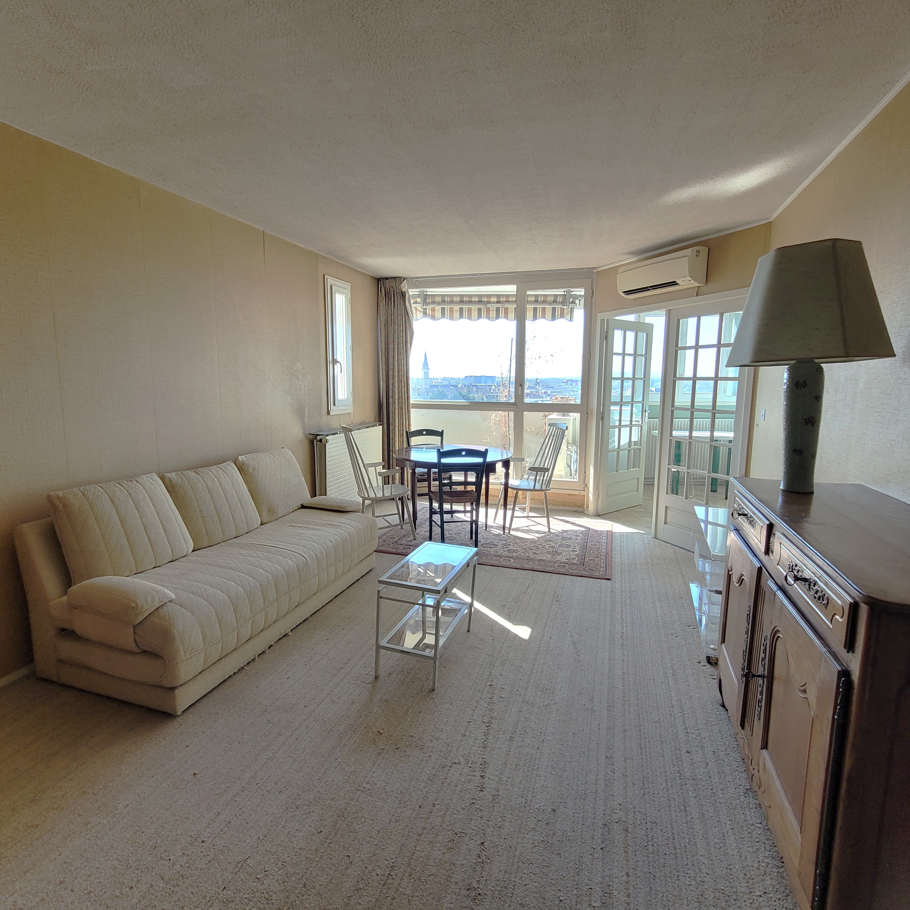 Le séjour, baigné de lumière, s’ouvre sur un balcon avec une vue dégagée, ce qui renforce cette agréable sensation d’espace.